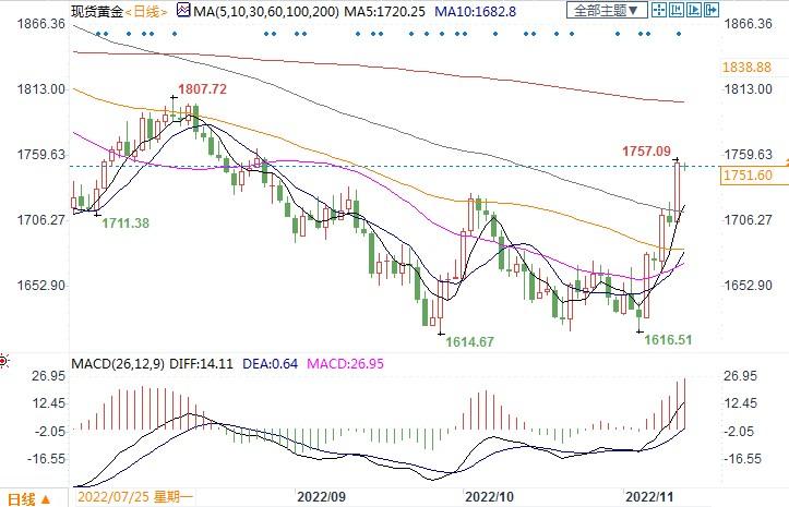 北京时间11月11日13:02,现货黄金报1751.60美元/盎司