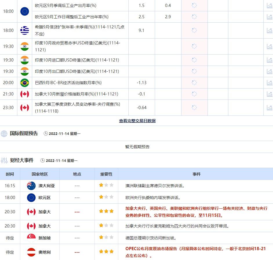 ①11月14日(周一)关键字:欧元区9月工业产出,OPEC原油市场报告