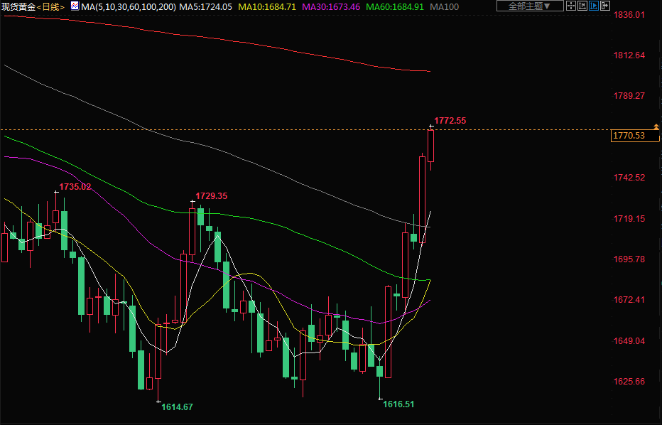 通胀数据引发了美元的大幅下跌,美元将创下近14年来的最大两日跌幅,这使得黄金对其他货币持有者更具吸引力。市场现在将美联储12月会议上加息50个基点的可能性定为71.5%,高于一周前的约50%。黄金在其50天和100天移动均线上方交易,这被交易员认为是一个看涨信号。