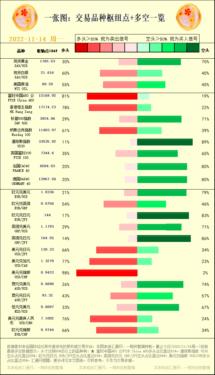 一张图:交易品种枢纽点+多空占比一览。截止今日(2022/11/14周一)目前最新多空数据显示,头寸达到80%及以上的品种有:★ 富时中国A50 ☆FTSE China A50多头占比高达81%。道琼斯指数 US30空头占比高达89%。欧元兑日元 EUR/JPY空头占比高达83%。