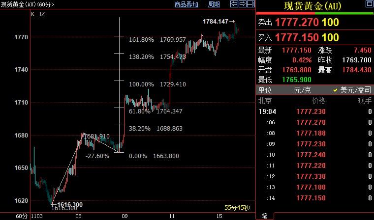 北京时间20:05,现货黄金上浮0.24%至1775.55美元/盎司;COMEX期金主力合约上浮0.11%至1778.8美元/盎司;美元指数下跌0.70%至106.134。