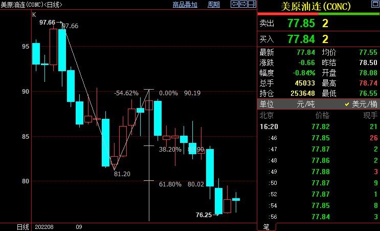 北京时间16:22,NYMEX原油期货下跌0.74%至77.92美元/桶;ICE布伦特原油期货下跌0.58%至84.37美元/桶。