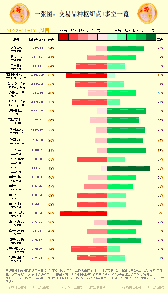 一张图:交易品种枢纽点+多空占比一览。截止今日(2022/11/17周四)目前最新多空数据显示,头寸达到80%及以上的品种有:★ 富时中国A50 ☆FTSE China A50多头占比高达85%。欧元兑日元 EUR/JPY空头占比高达88%。