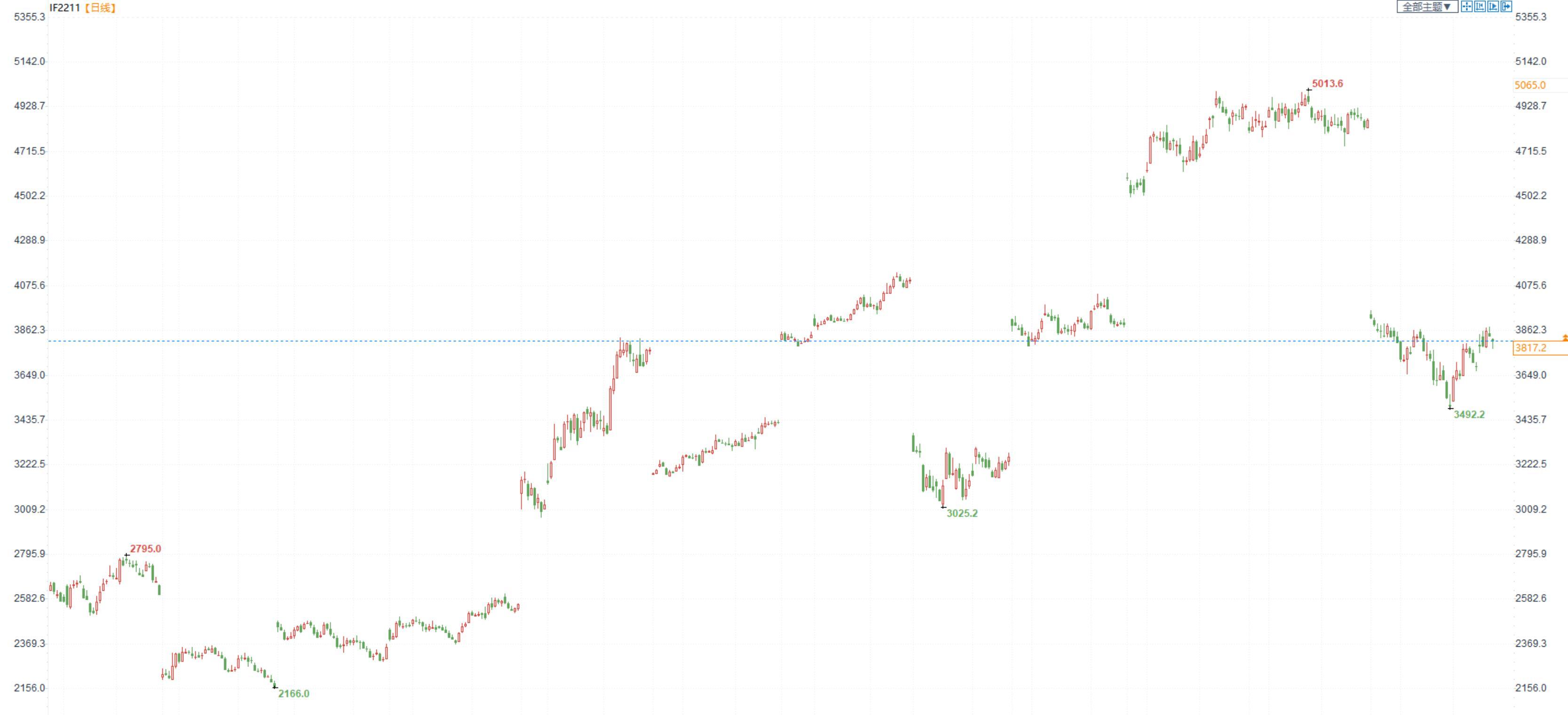 【今日涨跌】四大期指涨跌互现。IH2211收盘价为2562.4,收跌0.63%;IF2211收盘价为3817.2,收跌0.63%;IC2211收盘价为6215.2,收涨0.12%;IM2211收盘价为6715.2,收涨0.20%。