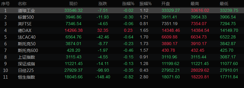 美股收盘情况:道琼斯工业指数下跌0.02%,至33546.32点;标普500指数下跌0.31%,至3946.56点;纳斯达克指数下跌0.35%,至11144.96点。