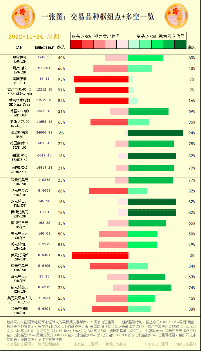 一张图:交易品种枢纽点+多空占比一览。截止今日(2022/11/24周四)目前最新多空数据显示,头寸达到80%及以上的品种有:★ 美国原油 WTI OIL多头占比高达93%。富时中国A50 ☆FTSE China A50多头占比高达91%。香港
