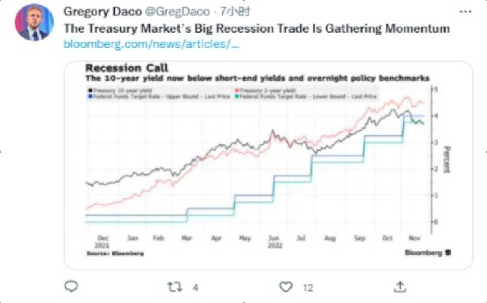 值得一提的是,在近来的美债走势中,一个容易被投资者忽视但却其实颇为关键的信号是:哪怕市场预计美联储在未来半年还会加息约1个百分点,但10年期美债收益率眼下却已经开始低于了3.75%-4%的联邦基金目标利率当前区间。