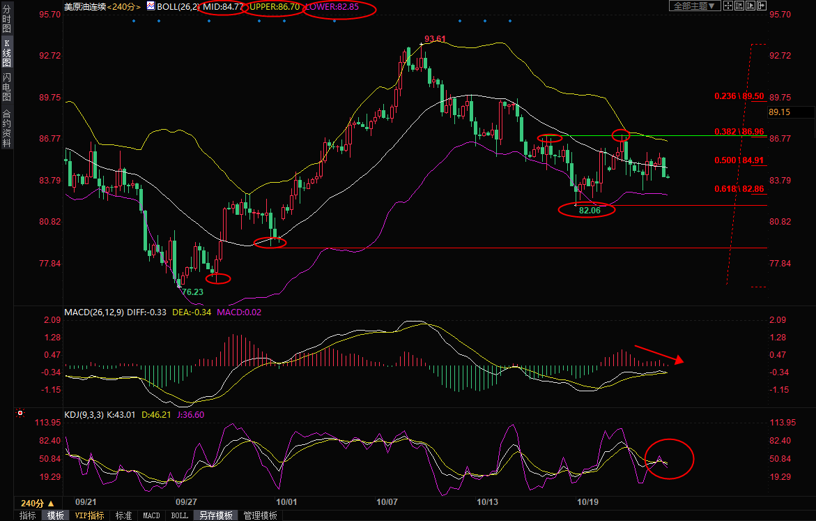 4小时级别:震荡;布林线轨道收口后水平运行,留意布林线轨道82.85-86.70区域突破情况,目前MACD红色柱萎缩,且有死叉趋势,KDJ金叉被破坏后初步死叉,短线略微偏向下行,如果跌破布林线下轨82.85支撑,76.23-93.61涨势的61.8%回撤位支撑也在该位置附近,则增加后市看空信号;进一步支撑在82.06附近,然后是80整数关口,9月30日低点支撑在79.12附近。