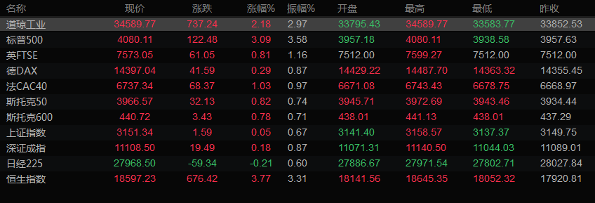 美股收盘情况:标普500指数跳涨3.09%,收报4,079.97点;纳斯达克指数大涨4.41%,报11468.00点;道琼斯工业指数急升2.18%,报34589.24点。