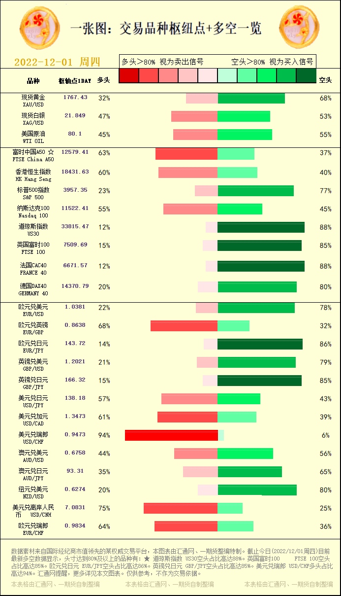 嘉盛集团APP讯——一张图:交易品种枢纽点+多空占比一览。截止今日(2022/12/01周四)目前最新多空数据显示,头寸达到80%及以上的品种有:★ 道琼斯指数 US30空头占比高达88%。