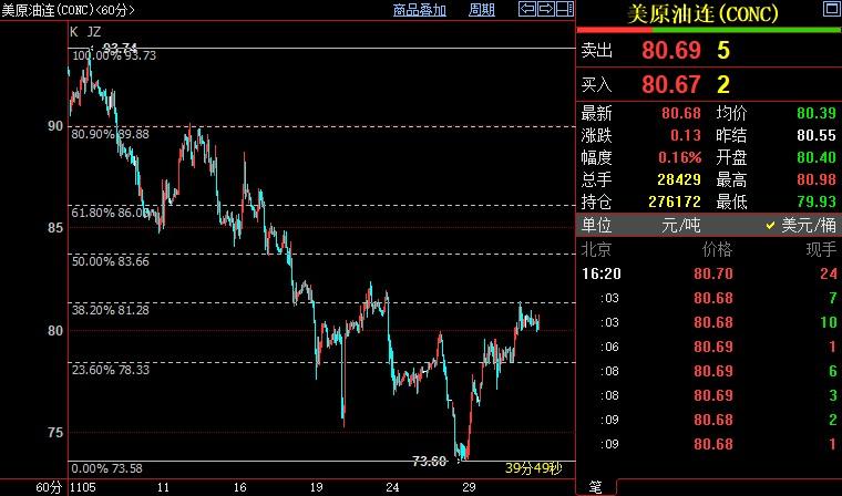 北京时间16:21,NYMEX原油期货上浮0.02%至80.55美元/桶;ICE布伦特原油期货上浮0.01%至86.98美元/桶。