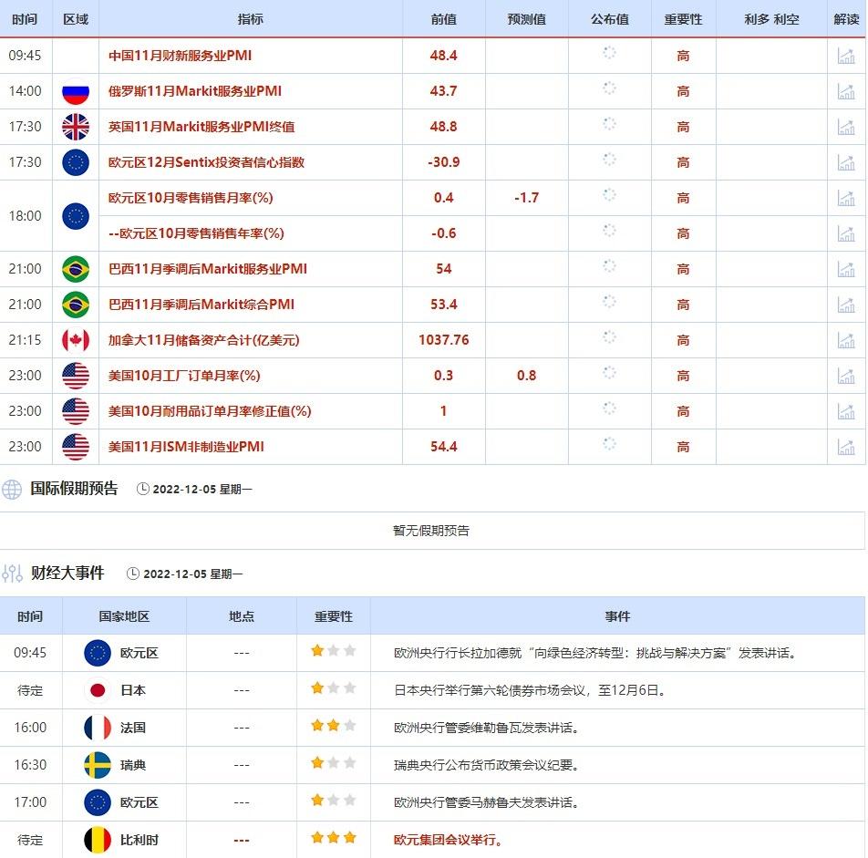 ①12月5日(周一)关键字:欧元区12月Sentix投资者信心指数,欧元区10月零售销售月率,欧元集团会议