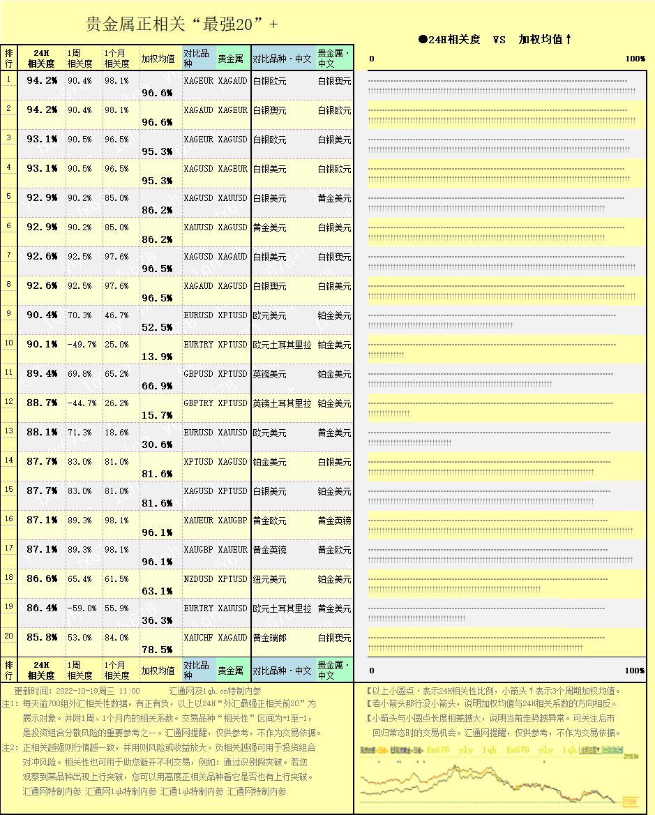 ★贵金属VS外汇的负相关最强前三个分别是:美元墨西哥比索(USDMXN) VS 铂金美元(XPTUSD)的“负相关”强度达到-93.60%。美元泰铢(USDTHB) VS 黄金美元(XAUUSD)的“负相关”强度达到-93.60%。美元捷克克朗(USDCZK) VS 铂金美元(XPTUSD)的“负相关”强度达到-93.00%。汇通网提醒,更多参考本文如下表格。