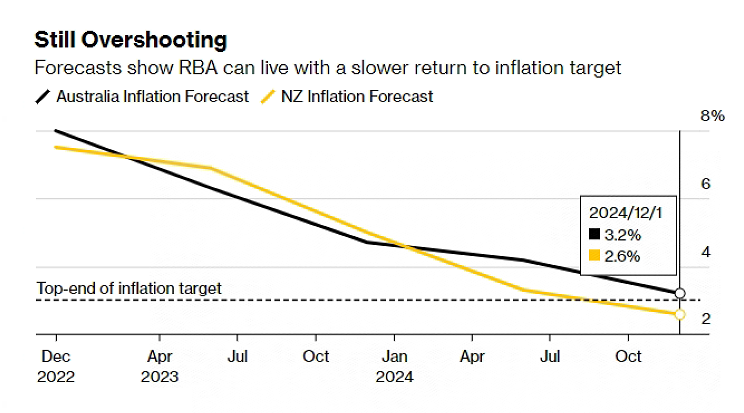 图3:仍然过度(预测显示,RBA回归通胀目标较慢。黑线指澳大利亚通胀预测,黄线指新西兰通胀预测,虚线指通胀目标的上端)