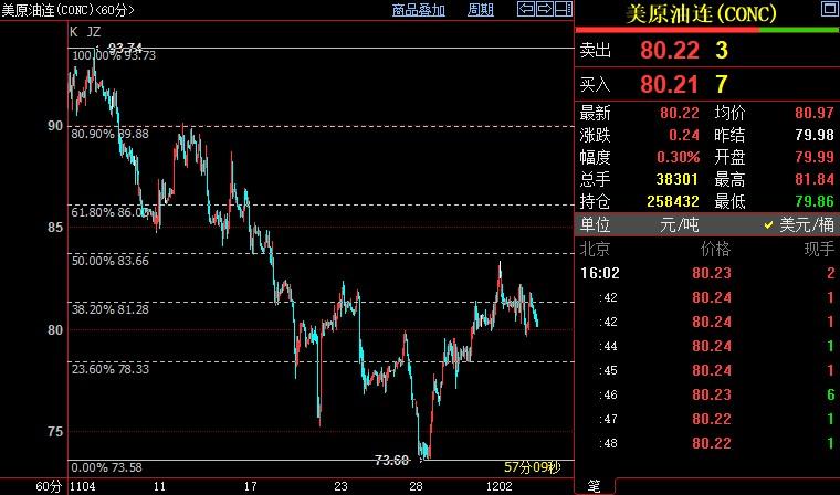 小时图上看,NYMEX原油,并重新回到81.29美元下方,并有望进一步下探78.35美元,它们分别是93.74-73.60美元下行区间的38.2%和23.6%斐波那契回档位。