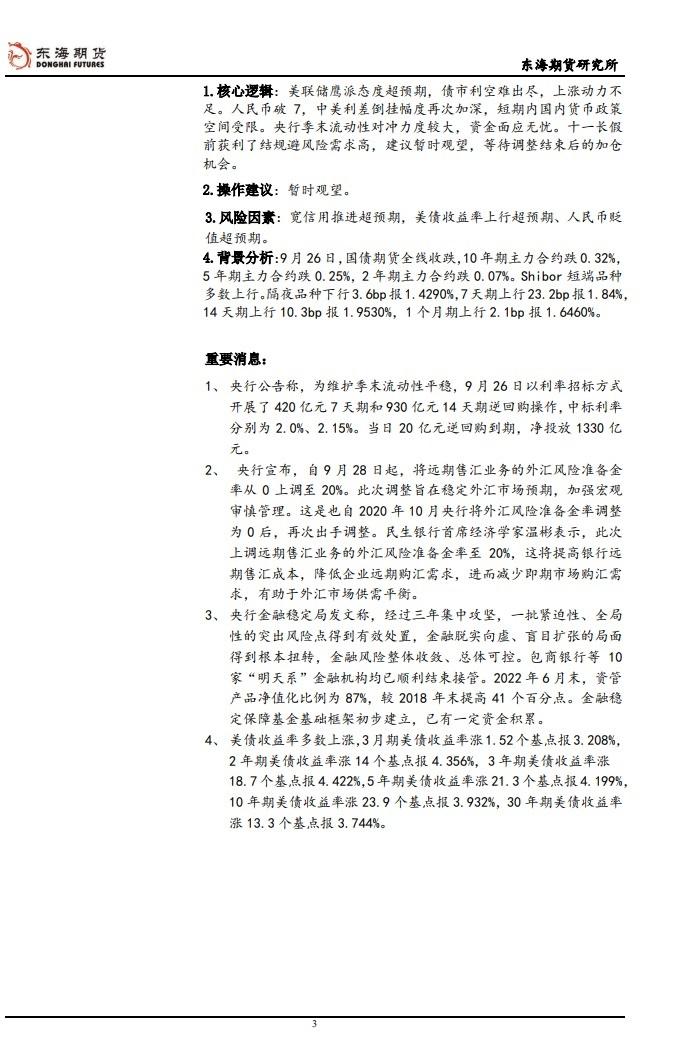 更新: 27 09月 股指期货操作建议:防御为主。国债期货操作建议:暂时观望。免责声明:本报告立足于结合基本面及技术面对市场价格运行趋势及轮廓进行整体判断,提示可能存在的投资风险与投资机会。报告中的信息均源自于公开材料,我公司对这些信息的准确性和完整性不作任何保证。报告仅作参考之用,在任何情况下均不构成对所述期货品种的买卖建议,我们也不承担因根据本报告操作而导致的损失。 东海期货公司授权文本由“专注期货开户交易及专业行情分析资讯网站”:【一期货 www.1qh.cn】转发 标题:【东海期货9月27日金融期货日报】:A股三大股指冲高回落,国债期货全线收跌 地址:https://www.jiasmai.com/article/9.html ← 一张图:9月27日黄金白银、原油、股指、外汇“枢纽点+多空信号” → 【东海期货9月27日宏观日报】:美元持续强势,全球风险资产继续下跌