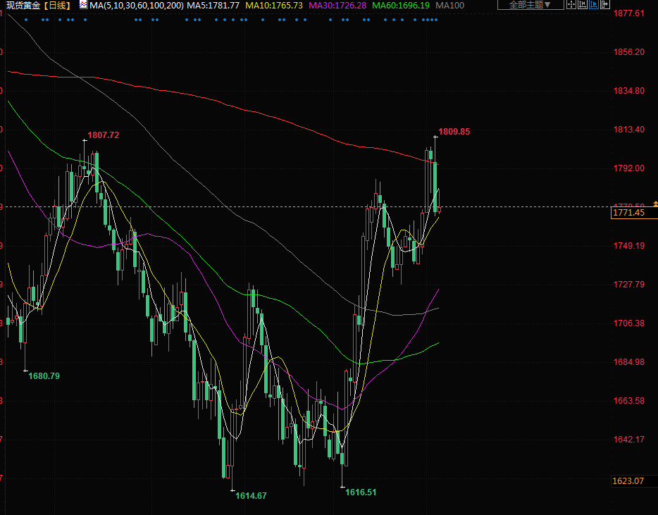 金价周二小涨,美元回吐近期的部分涨幅,美国国债收益率回落,交易员等待有关美联储加息策略的进一步线索。现货金上涨0.1%,至每盎司1769.42美元,走势陷于窄幅区间。