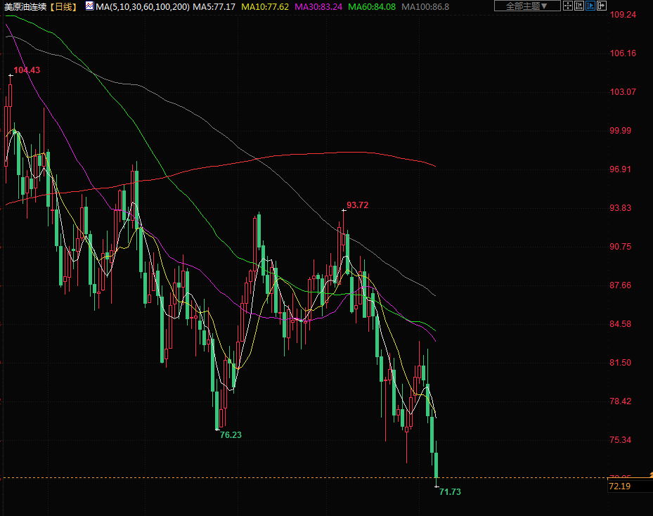 布伦特原油期货下跌2.8%,结算价报每桶77.17美元,创年内收盘新低,打破了今年第一天触及的78.98美元的前低位。美国原油期货下跌2.24美元,结算价报每桶72.01美元,打破了周二创下的年内收盘低位。