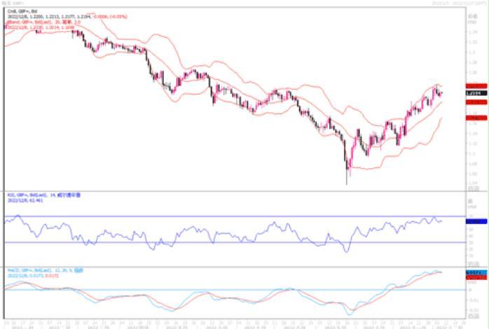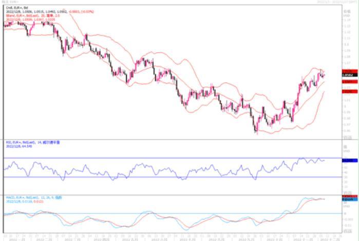 周三(12月7日),欧洲央行管委会委员peter kazimir暗示其支持下周欧央行会议上连续第三次加息75个基点。他指出,鉴于欧元区的任何经济衰退都可能较为短暂,而通胀率即使在2025年也将依然高于目标水平,官员们应迅速将利率上调至足以令经济活动降温的水平。该委员的发言是对欧央行12月份会议大举加息予以的最强烈支持言论之一。除了利率上调幅度,欧央行官员们还将讨论如何开始到期减持近年来作为刺激措施一部分而购买的约5万亿欧元债券。受欧央行鹰派的态度刺激,在隔夜外汇市场上,欧元继续在震荡中逞强,对美元收盘再回到1.05楼上。欧元昨日反弹日线报收上下影线小阳线,技术指标经前两个交易日回落调整后,下跌倾向有所改善。从4小时图来看,汇价再度攀升回短期均线上方,MACD零轴附近运行,绿色动能柱开始收敛,随机指标KDJ底部交叉上走,显示欧元多头短线内仍将具有韧劲。预料下周利率会议前欧元对美元多空在1.05水平的争夺较为激烈,若汇价能再次彻底企稳1.05上方,则欧元对美元后市有望进一步攀高。