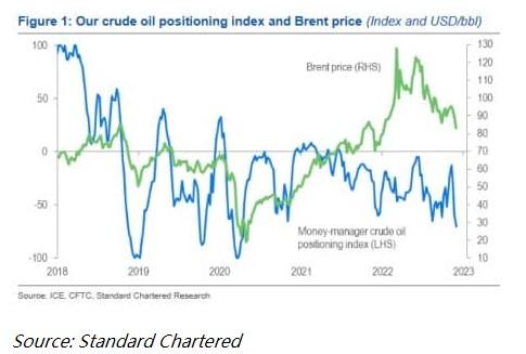 专家们表示,油价受到自上而下的宏观交易回流的影响,经济层面的正面和负面消息都引发了抛售。根据渣打银行的数据,由于担心衰退,负面的美国经济数据点正在引发油价抛售。然而,讽刺的是,由于美元走强,积极的数据点也产生了类似的影响。