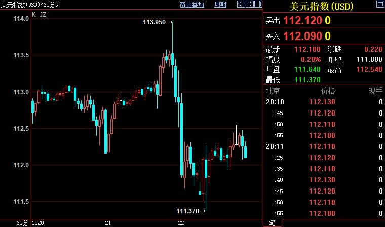 北京时间20:11,现货黄金下跌0.40%至1649.35美元/盎司;COMEX期金主力合约下跌0.14%至1653.7美元/盎司;美元指数上浮0.22%至112.120。