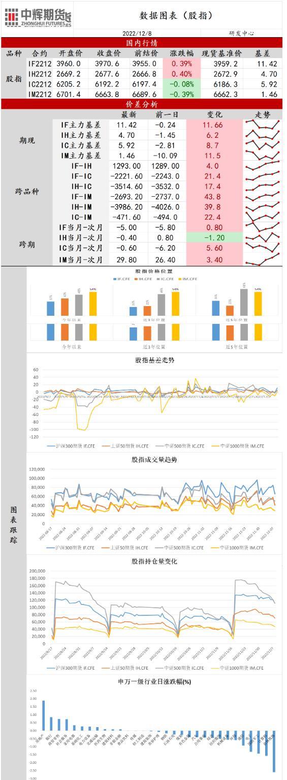 2、今日三大指数集体回调,早盘小幅低开后呈窄幅震荡整理态势,沪指在半年线上方蓄势整固,盘面整体反弹动能衰减。行业轮动格局持续,随着政策预期被市场计价,资金谨慎流入低位板块,政策受益行业反弹持续性较强。市场风险偏好好修复后,投资者静待基本面数据的支撑,两市成交额连续三个交易日回落至万亿以下。离岸人民币一度上逼6.95元,日高较日低升超400点,逼近9月中旬以来的近三个月高位,北向资金连续8个交易日温和净流入。隔夜美股延续下跌,市场风险情绪低迷。标普500和道指盘中震荡拉升尾盘转跌,纳斯达克指数全天低位震荡。投资者衰退担忧主导市场,继摩根大通、美国银行和高盛之后,花旗集团CEO Fraser也悲观预言,美国经济恐将在2023年下半年陷入衰退,华尔街正为高通胀和利率走高削弱消费者需求做准备。美债收益率连跌两日,且短债收益率跌幅更深。美元指数失守105关口,2年和10年期收益率曲线倒挂幅度扩大超85个基点,创1981年以来最大幅度,凸显市场强烈担心衰退临近。美国三季度劳动力成本低于预期,单位劳动力成本涨幅2.4%,较初值3.5%大幅下调。12月美联储加息50个基点的概率上升至91%,同时投资者关注11月美国CPI数据。加拿大央行加息50个基点符合预期,全球高通胀开始退潮,加拿大央行首次在决议声明中删除“需要进一步加息”措辞,未来全球央行暂停加息的预期上升。欧元区三季度GDP环比终值上修至0.3%,同比增2.3%,均高于初值,欧元区的衰退进程缓于投资者的预计。国内积极因素不断,国内11月进出口同比增速进一步下行,内外需求走弱叠加国内疫情扰动,11月出口继续超预期下行。未来随着欧美国家步入衰退,我国出口增速依然有下行的风险,提振内需的重要性不言而喻。12月7日防疫“新十条”发布,居民出行以及企业的生产经营未来受到疫情的扰动减小,北京,上海和广州等一线城市率先响应国家防疫政策优化调整,有望激发一线城市的消费活力。中央经济会议落地,政策强调明年要统筹疫情防控和经济社会发展,加强各类政策的协调配合,未来政策合力下国内经济增速有望回升。短期来看,临近年底政策预期较强,但基本面承压状态未变,股指预计维持偏强震荡。申万一级31个行业中11个行业上涨,其中房地产行业领涨,农林牧渔行业领跌。