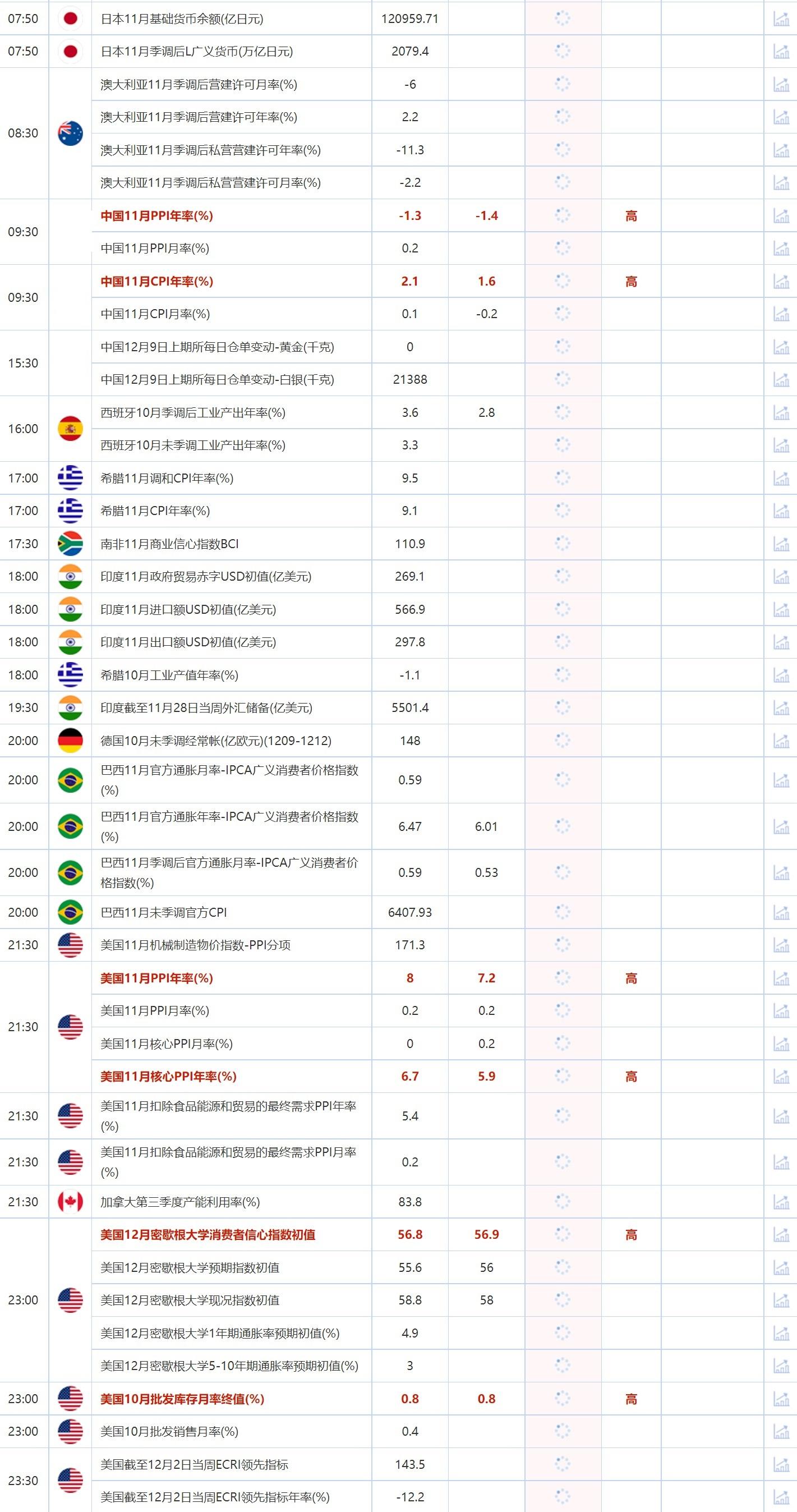 09:30 中国11月PPI月率(%) , 前值 0.2 , 预期值 -- , 公布值:待发布