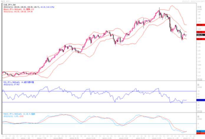 上周美元兑日元基本在135-1.38区域内进行窄幅的整理之中。上周,由于美联储调升利率峰值预期走高,美元预计将保持强劲,曾促进美元兑日元略有反弹。而且日本央行董事会成员中村丰明表示,调整货币政策为时尚早。他说,日本央行需要继续坚持货币宽松政策,并指出日本通货膨胀还没有对工资产生影响。因此,必须仔细监测明年春天工资的转变。尽管如此,日本央行行长黑田东彦关于退出超宽松货币政策的言论帮助限制了日元的跌幅。黑田东彦承认,通胀压力存在上行风险。他的言论给投资者一个感觉是,日本央行是否也快开始使货币政策回归正常,这导致美元/日元走势出现低位徘徊状态。日线图上,MACD 信号线出现低位死叉迹象,RSI在45略下方停滞。在本周欧美央行利率会议前,要小心防范美日借机反弹的风险,上方初步阻力在140,下方强支撑在135水平。