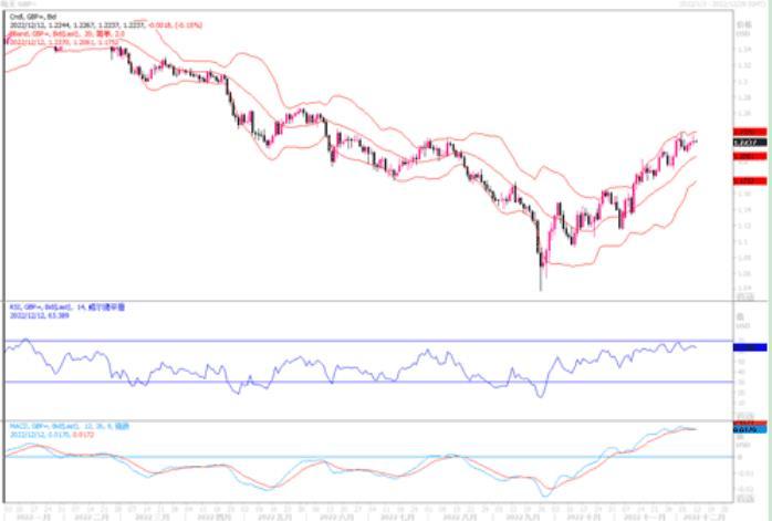 英镑兑美元周五(12月10日)持平,但仍在近六个月高点1.2263附近。分析师预计,尽管经济陷入衰退,英国央行下周将再升息50个基点。全球金融服务公司Ebury的市场策略主管Matthew Ryan指出,未来几天预计不会有大的波动,因为接下来央行的政策会议非常难以预测。他认为中长期看好英镑,因为市场目前是反映英国经济的最坏情况,而且有些过头了。也就是说,英国最困难的时期似乎已经过去。从日线图上观察,英镑兑美元暂时仍保持在上行通道中,但技术指标均处在超买水平,且渐渐似乎有顶背离迹象出现,要谨慎防范冲高遇阻回撤调整的风险。上方目前在1.2350附近的阻力较大,若能突破则存在朝1.26-1.28挺进的机会,否则遇阻回落,将会再次考验下方1.20-1.18区域的支撑强度。